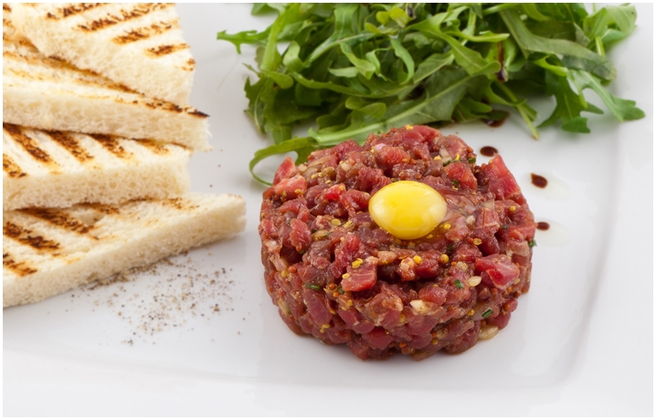 Мелко рубленная Австралийская говяжья вырезка, с каперсами, луком шалот и себулет, ворчестером и яичным желтком, на тостах