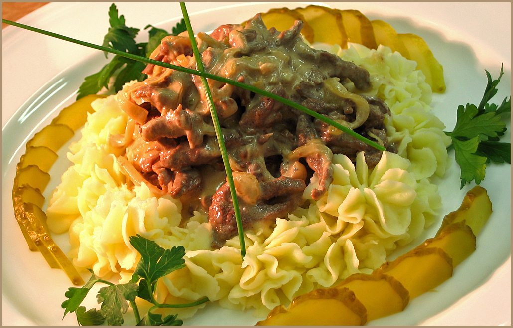 Beefstroganoff with sourcream, puree of potatoes and salted cucumbers
